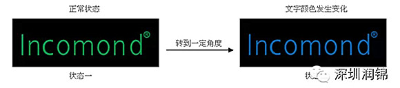 肉眼直接觀察防偽標簽時,Incomond正視為綠色,轉動約50度視角之后,直接變為藍色Incomond。